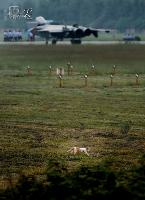 在2002号歼-20战斗机测试现场,出现了一只黄白相间的猫,网友戏称这是“喵星人”前来围观歼-20。(超大军事 dj1023 供图)