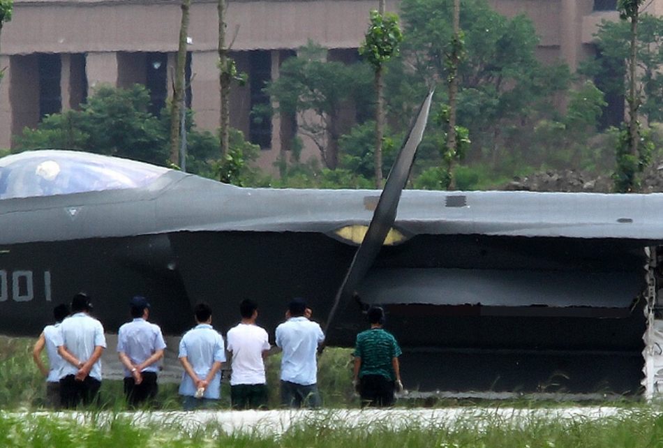 网友拍摄到的正在进行地面测试的2001号歼-20战斗机,可以看到鸭翼转动时耦合部位露出的黄色底漆。(战略网腹黑猫 拍摄)