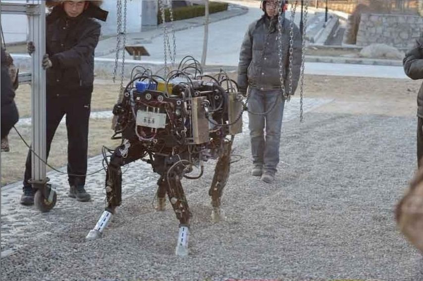 近日,一组我国正在研制的四足机器人的照片引起关注。这款机器人由4条长长的腿和一个机身组成,就如同一只没有头的狗。从外形上看,这款机器人与美国研制的“大狗”(Bigdog)军用机械狗十分相似,都采用了相同的四足设计,只是中国的这款机器人在尺寸上稍微小一些。