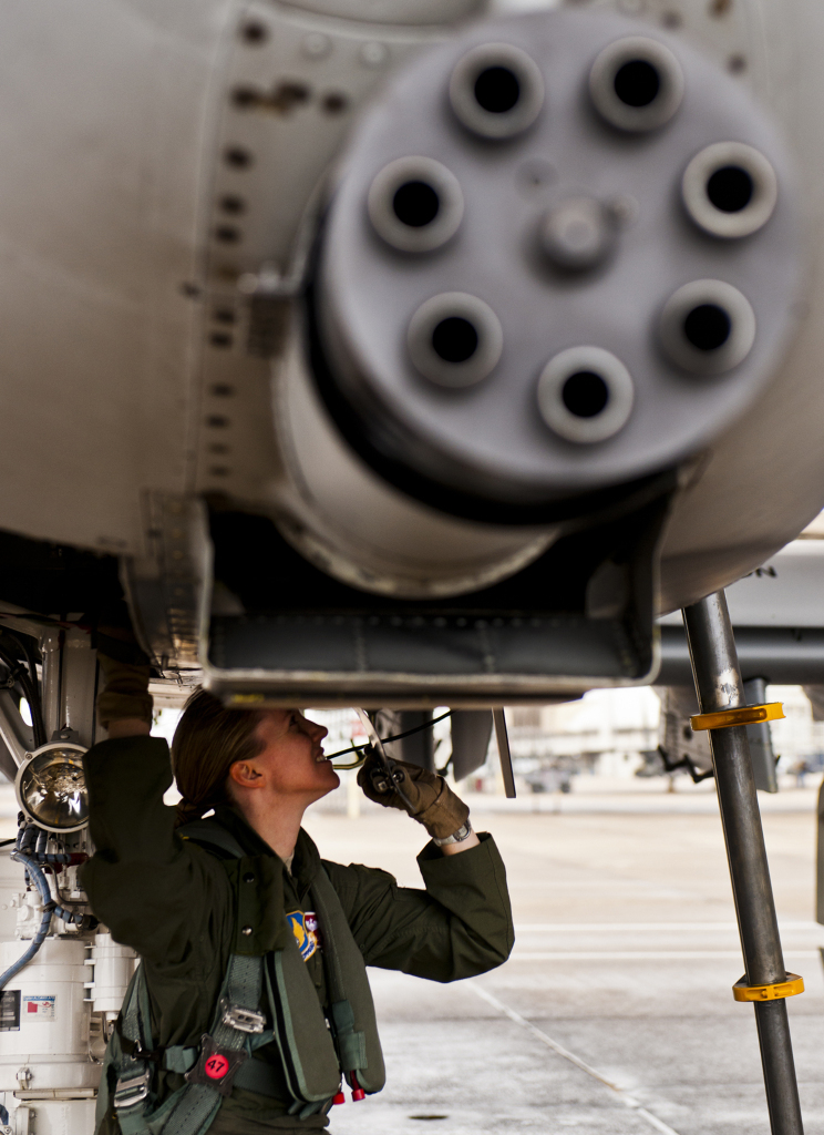 2013年1月10日,驻佛罗里达州的埃格林空军基地内,美国空军第40次飞行测试中队女飞行员奥莉薇-诶里欧特正在检查A-10雷电II攻击机。该机将测试新的Net-T升级软件,该软件主要用于先进瞄准吊舱。