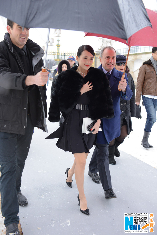 章子怡披皮草秀红唇现身巴黎 获LV高层撑伞拍照