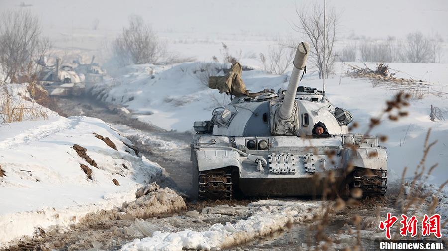 近日,沈阳军区某装甲旅坦克梯队近日进行雪野训练。越沟壑、趟冰河,经过两个小时的长途机动,准时到达预定地域。中新社发 谷杰锋 摄
