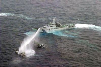 昨天,日本公务船对台湾保钓船“全家福”号和护送该船的台湾“海巡署”巡逻船进行水炮攻击。图/CFP