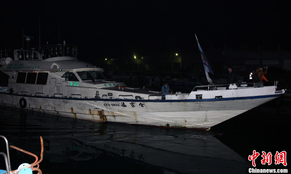 1月24日,受日本方面造浪、排放黑烟、喷水未能将妈祖神像送上钓鱼岛供奉,中途折返的台湾保钓渔船“全家福号”当晚约10时许返回新北市瑞芳深澳渔港。“全家福号”渔船于24日凌晨1时45分由新北市深澳港出发前往钓鱼岛海域进行保钓活动。图为“全家福号”返回新北市瑞芳深澳渔港。中新社发 陈立宇 摄