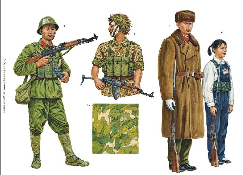 书中插图对越自卫反击战式军服(左、中)及65式军服仪仗队冬季制服和民兵的装备。