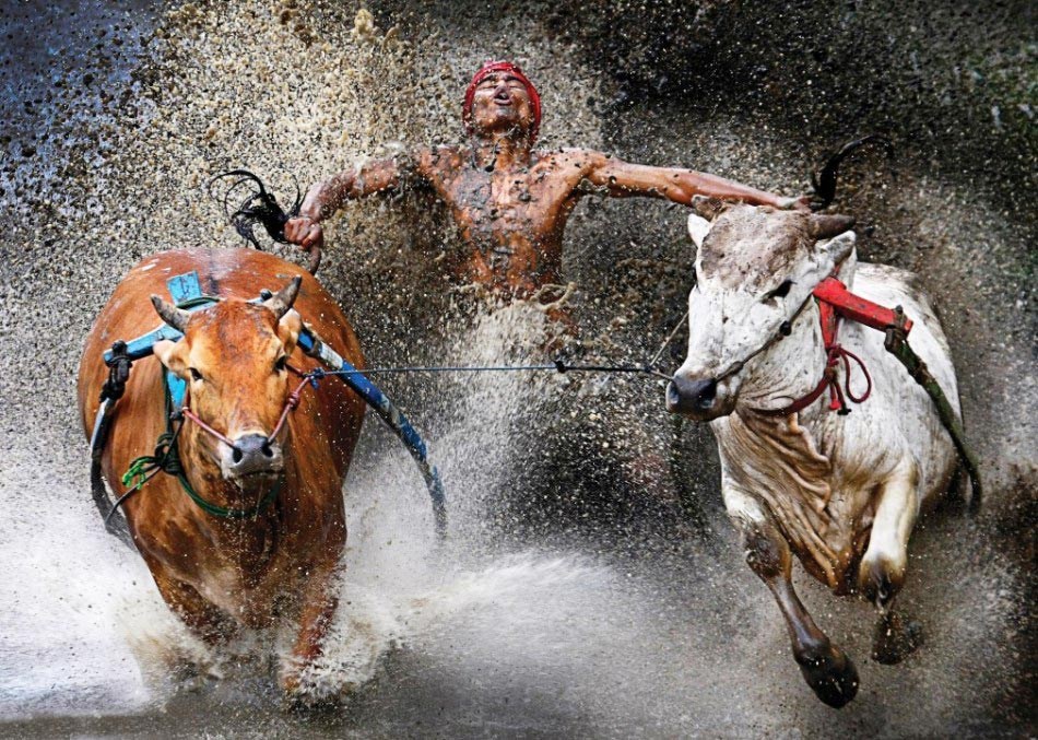 【动作类单幅一等奖:冲过终点的喜悦】马来西亚摄影师Wei Seng Chen摄于2012年2月12日。在收获季节结束时,印尼苏门答腊流行公牛赛跑,参赛者脚踩拴在两头牛中间的马具上,拽着牛尾巴比赛。图为一名选手冲到终点时流露出喜悦之情。