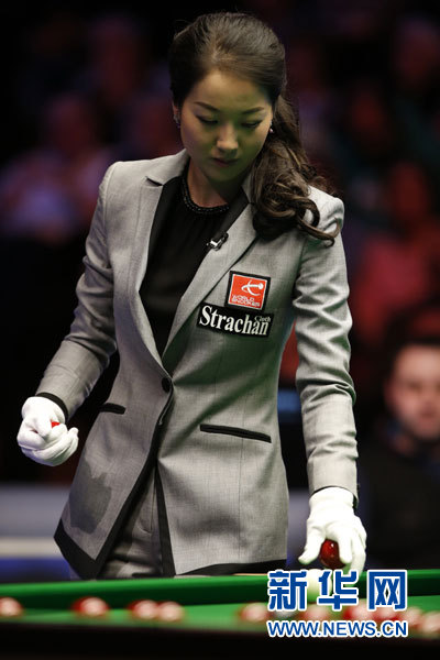 2月17日,中国裁判诸瑛在比赛中。当日,在英国威尔士南部纽波特市纽波特中心举行的2013年威尔士斯诺克公开赛决赛中,苏格兰选手斯蒂芬·马奎尔迎战英格兰选手斯图亚特·宾汉姆。本场比赛由中国女裁判诸瑛执裁,这也是来自亚洲的裁判第一次执法国际斯诺克排名赛决赛。新华社记者王丽莉摄