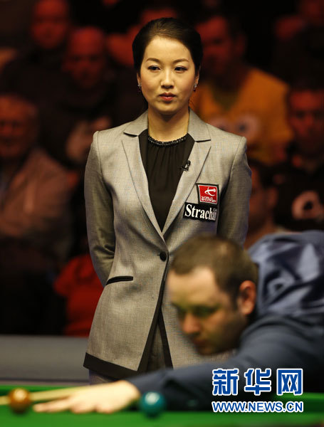 2月17日,中国裁判诸瑛在比赛中。当日,在英国威尔士南部纽波特市纽波特中心举行的2013年威尔士斯诺克公开赛决赛中,苏格兰选手斯蒂芬·马奎尔迎战英格兰选手斯图亚特·宾汉姆。本场比赛由中国女裁判诸瑛执裁,这也是来自亚洲的裁判第一次执法国际斯诺克排名赛决赛。新华社记者王丽莉摄