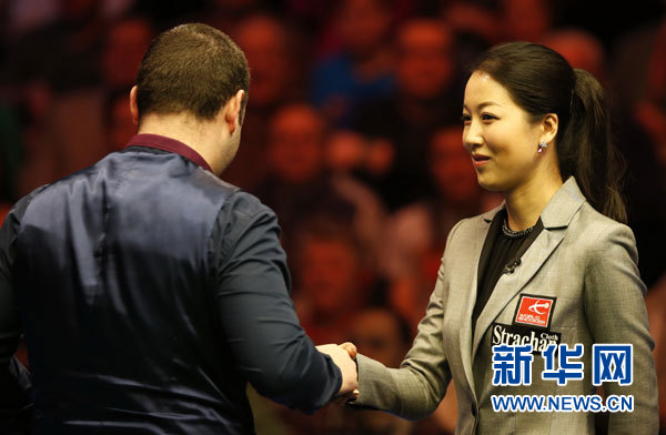 2月17日,中国裁判诸瑛(右)在比赛前与苏格兰选手斯蒂芬·马奎尔握手致意。当日,在英国威尔士南部纽波特市纽波特中心举行的2013年威尔士斯诺克公开赛决赛中,苏格兰选手斯蒂芬·马奎尔迎战英格兰选手斯图亚特·宾汉姆。本场比赛由中国女裁判诸瑛执裁,这也是来自亚洲的裁判第一次执法国际斯诺克排名赛决赛。新华社记者王丽莉摄