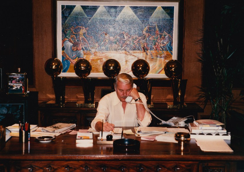 杰里-巴斯在其34年的湖人老板生涯中为湖人夺得了10尊奥布莱恩金杯,其最引以为傲的是在80年代打造了华丽奔放的“表演时刻”,其办公室一直挂着一幅“表演时刻”的油画。