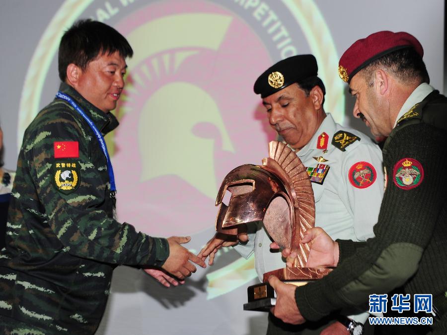 3月28日,在约旦首都安曼,中国武警代表队总领队何利(左)领取冠军奖杯。为期5天的约旦第五届“勇士竞赛”国际特种兵比武28日落下帷幕,中国武警代表队以总分第一的成绩夺得冠军。3月24日至28日,来自世界18个国家的33个代表队云集位于安曼东南部扎尔卡省的约旦阿卜杜拉国王特战训练中心,参与“勇士竞赛”角逐。新华社记者程春香摄