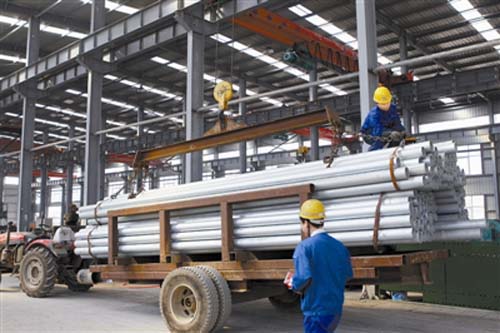 2012年3月落户明港产业集聚区的河南中联公司200万吨钢材深加工项目,一期工程总投资12亿元,已建成生产线12条,累计实现主营业务收入9.24亿元、利税4165万元。预计二期工程全部建成投产后,可实现年销售收入120多亿元、利税6亿余元,可新增就业岗位1500余个。图为昨日该公司工人在车间里紧张工作时的情景。张万斌 摄