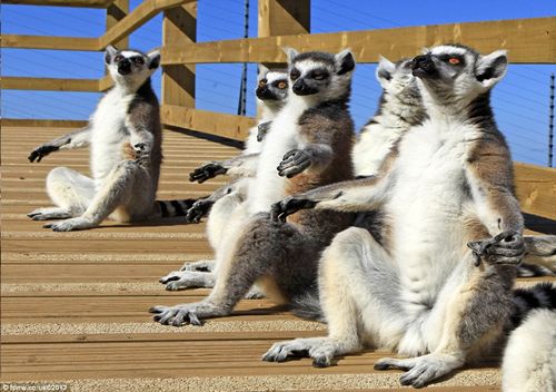 然而对于习惯了高温天气的狐猴来说,这却是一个晒太阳的好天气。热烈的阳光吸引着威尔斯动物园的众多狐猴“列队”坐在站台上,四肢张开,尽情享受阳光的直射。