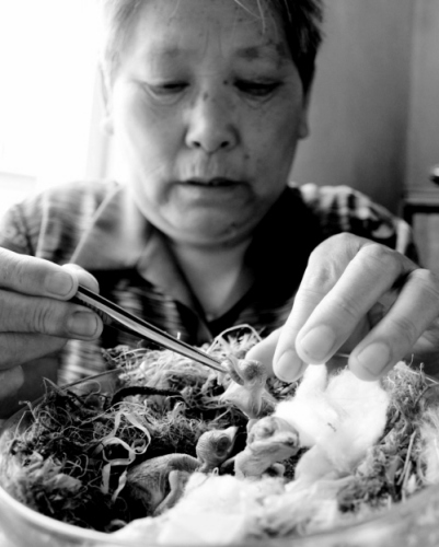 昨日14时,这三只小燕子连同被捅坏的小窝被付大娘放进了玻璃碗里。小燕子通体发灰,身上还没长羽毛,眼睛也没睁开,一动不动地窝在燕子窝里。“大燕子走后,我看它们饿得直伸脖子张嘴,就去附近的鸟市买了些可供燕子食用的虫子,喂了它们一些。”付大娘说。