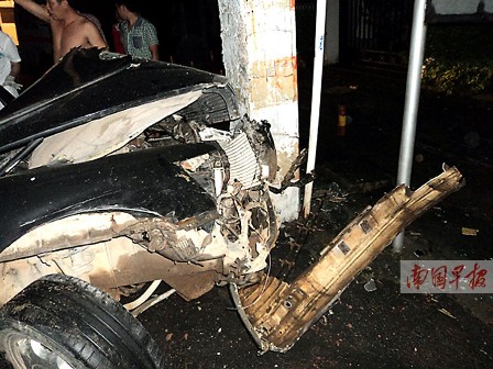 事后发,家住北海市中山东路的黄先生第一个赶到现场。他说,事发时间约在当日凌晨2时10分,车祸就发生在他家门外。当时,他听到一声巨响,出门就看到一辆黑色雷克萨斯汽车撞上了“北海大清邮局”旧址前的一根方型电线杆,车头被撞得散了架,一名男子倒在座位上。