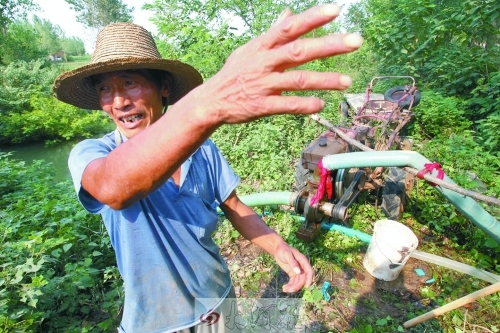 信阳罗山莽张镇槐店村的袁永龙在给自家稻田抽水 记者 李文波 通讯员 陈世军 摄影
