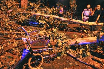 记者闻讯赶到沿江大道蔡锷路口,两棵相距不到10米、半米多粗的法国梧桐拦腰倒在了蔡锷路上。其中一棵连根拔起,并撬起一块七八平米的地板砖。另一棵树从2米左右处断裂,两根10多米长的碗口粗的枝干横亘在路上。一辆轮椅车支离破碎,地上散落的枝叶中还留有一摊血迹。