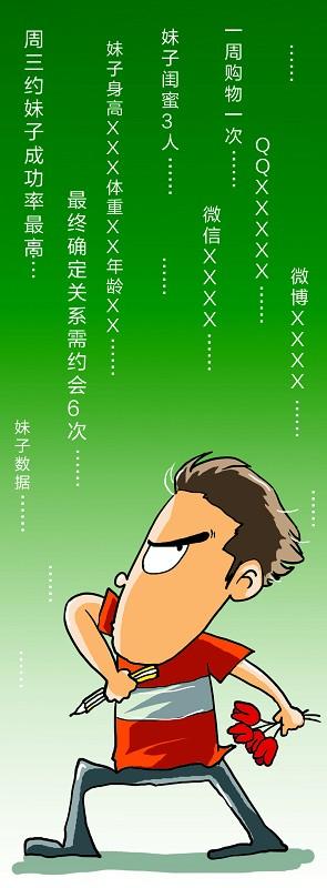 记者追访:追女生靠的是什么?诚意!勇气!近日,一条建议用数据分析追女神的微博走红,该微博称,追女孩也要讲究科学方法,掌握相关数据十分关键:从第一次与妹子约会到最终确定关系平均需要六次,周三约妹子成功率最高;除掌握身高、体重、年龄等基本数据外,生理周期、闺蜜人数、购物频率等都相当重要;此外,还要用到微博、微信、QQ各种社交工具……