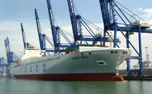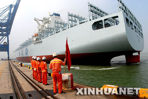 2007年8月9日,世界第三、亚洲最大的1万标准箱集装箱船“中远亚洲”号在天津港首航,投入到中国至欧洲航线的运营中。这是首条中国拥有全部产权、并由中国船员驾驶的集装箱巨轮。(图片来源:新华网)