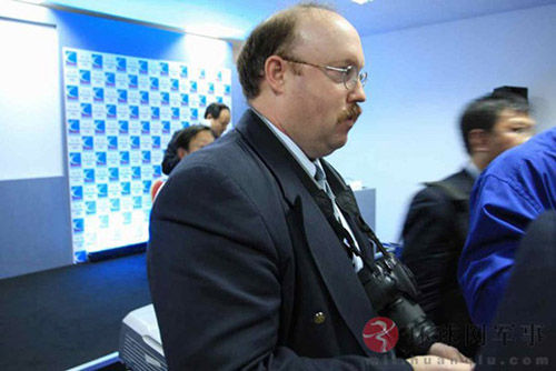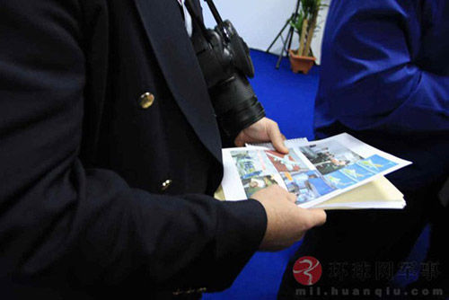 《国际评估与战略中心》的“中国军事问题专家”理查德·费舍尔(右)向中航工作人员提问中国最新武器信息。(资料图)