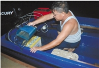 暴雨后清理渔政艇内的积水