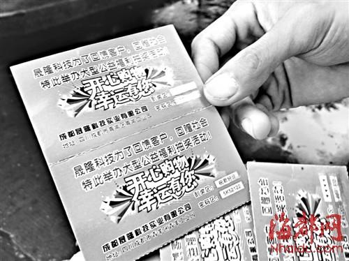 这两天,在福州晋安区南平西路,沈先生和朋友张先生不约而同,都捡到了一盒包装精美的“抽奖卡”。卡上大概内容为,“成都晟隆科技实业有限公司,为了回馈客户,举办大型公益福利抽奖活动……其中,一等奖为豪车一辆,二等奖为24万元现金”。盒内,9张“抽奖卡”夹着1张出库单和1张20元的纸币。刮开“抽奖卡”,两人都中了24万元的“大奖”。